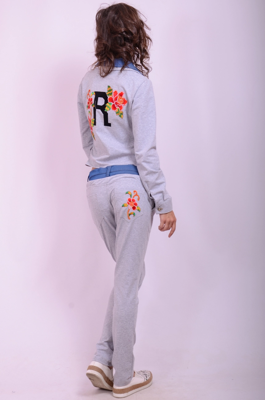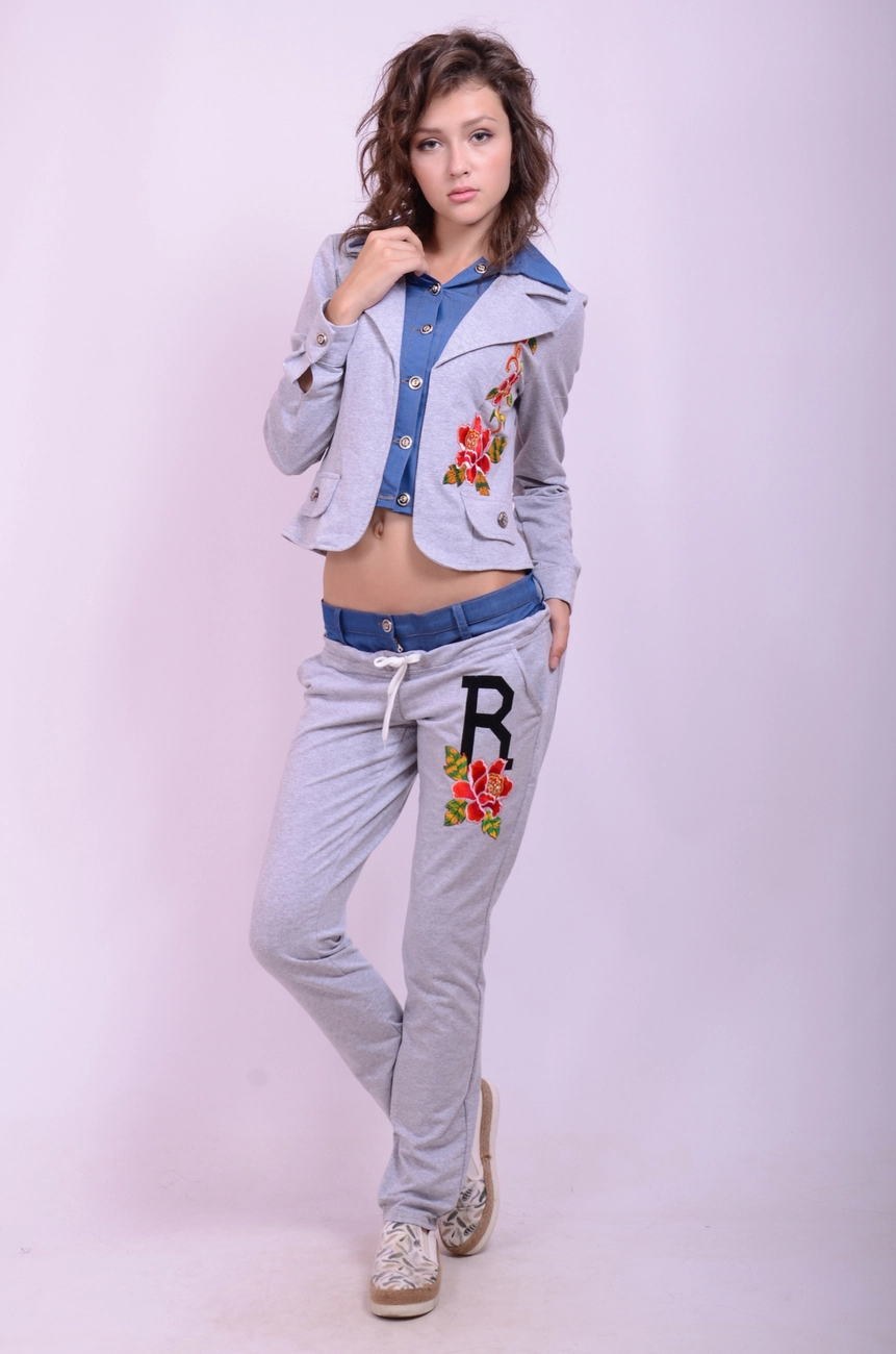 Костюм для отдыха состоит из пиджака и брюк,выпонен из трикотажного полотна 2-хнитка турецкого производства отделочные детали из джинса по спинке пиджака и полочки,на карманах брюк апликации,разм 42-44-46