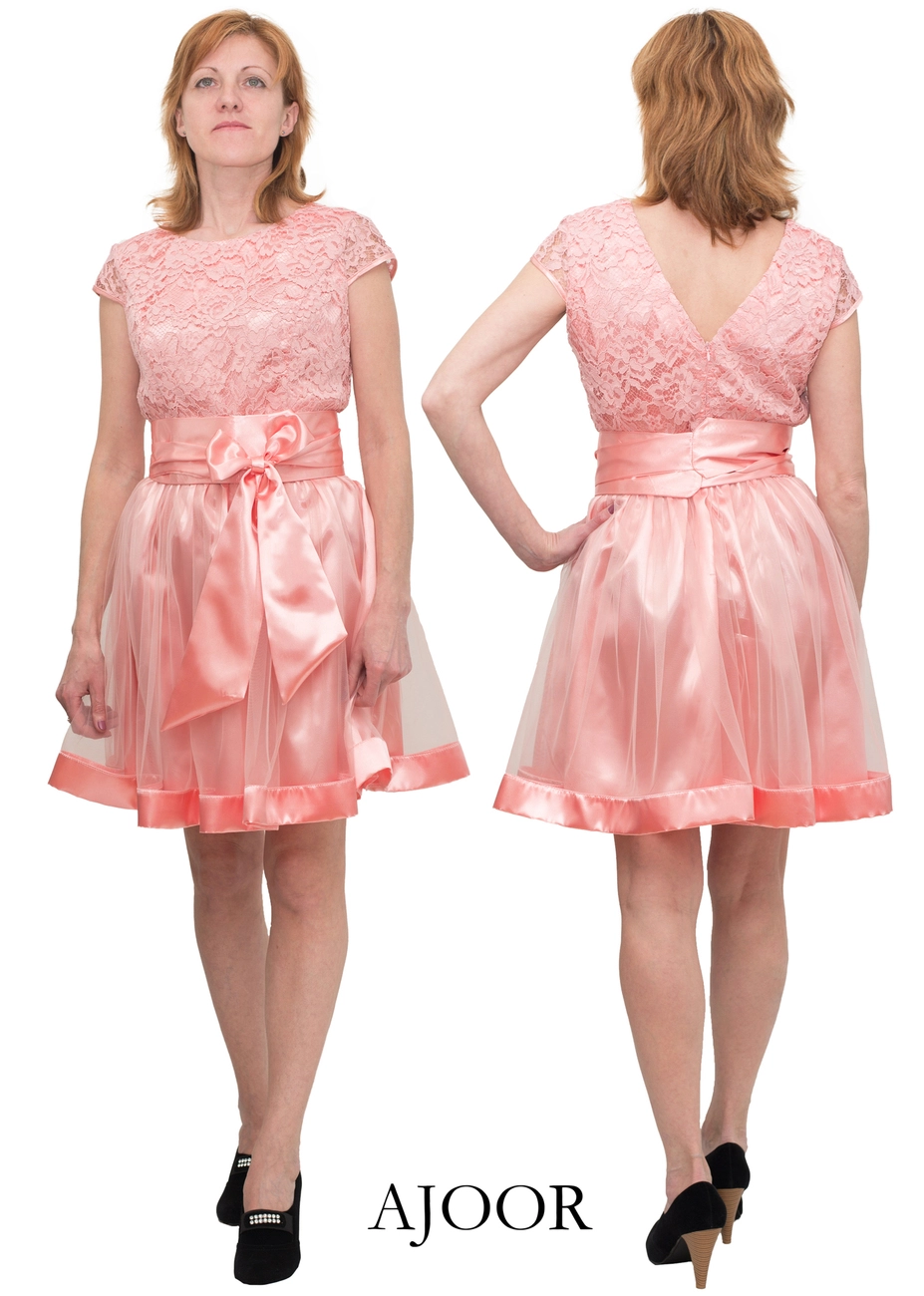 нарядное платье выполнено из гипюра и сетки,платье на подкладке из тафты в тон платья низ юбки и пояс из атласа.На спинке V-образная горловина. Разм42-44-46.