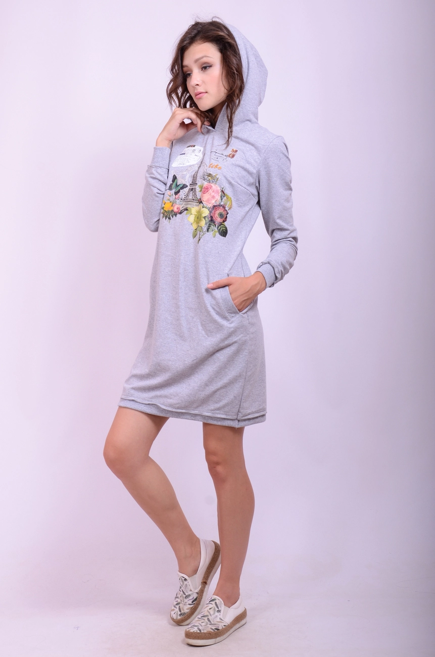 Платье выполнено из трикотажного полотна 2-хнитка турецкого производства.платье с капюшоном и прорезными карманами на полочке накат эфилева башня.Разм 42-44-46.
