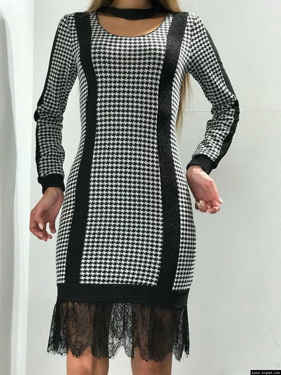Платье выполнено из трикотажа с рисунком гусиная лапка,отделка кружево,разм 46,48,50,52,цвет как на фото