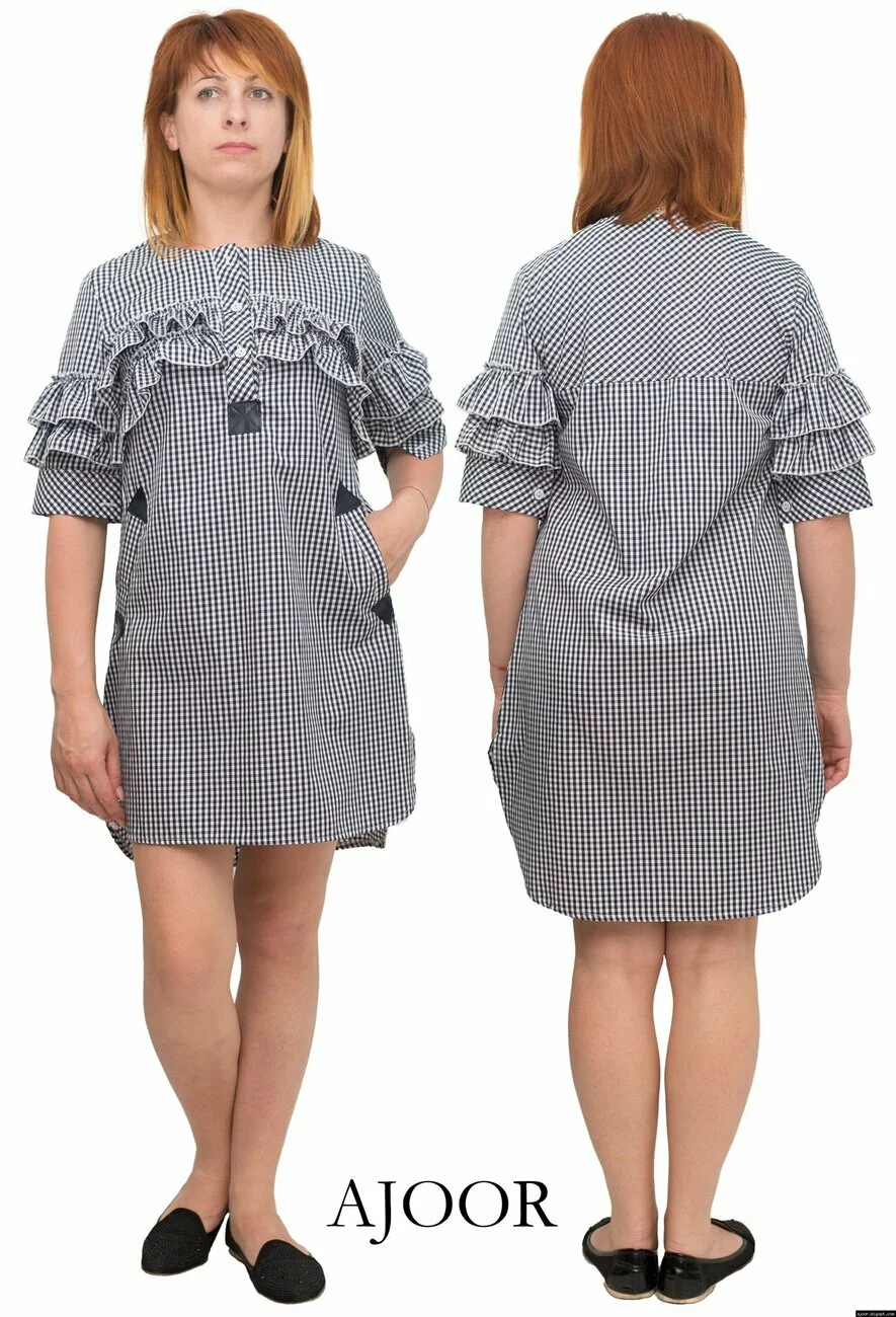 Платье выполнено из коттона в мелкую клетку.По груди и рукаву настрочены оборки,прорезные карманы и планка закончены элиментами из экокожи,спинка удлиненая по бокам разрезы. разм 42-44-46