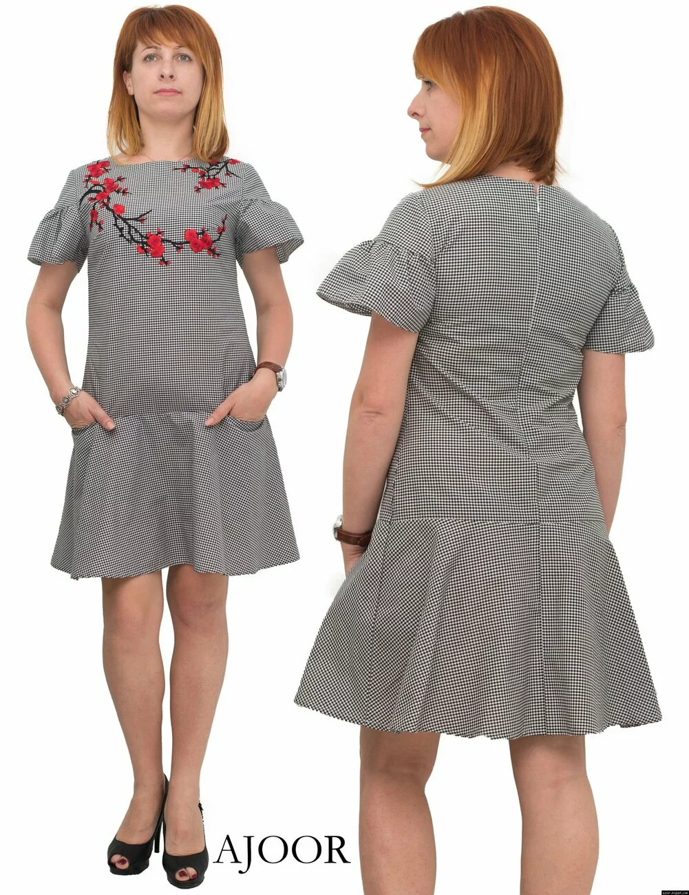 Платье выполнено из коттона в мелкую клетку.Полочка платья украшена апликацией ввиде сакуры, по рукаву и низу платья оборки,по спинке потайная молния.Разм 42-44-46